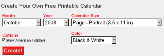 ePrintableCalendars allows you to design and print custom weekly, monthly or yearly calendars. You can also select colors and the printout size (A4, Business Card, Index Card).