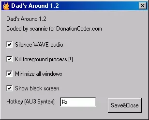 Dad’s Around, which is activated with the Windows Key+Z combination, allows you to silence all sounds, minimize all windows, and throw up a black screen. The most dangerous option however, is the “Kill Foreground Process”, which does not raise any prompts or warnings, but very silently kills off the application.